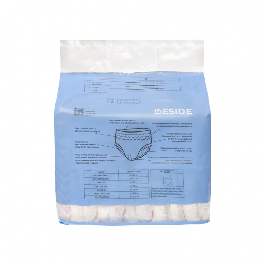 Представлены в размерах M, L и XL в количестве 10 шт в упаковке, а также в 2-х расцветках - "зигзаг" и "перья". Объем впитывания жидкости: M - 1400 мл, L - 1700 мл, XL - 2000 мл. В ассортименте Beside присутствуют одноразовые подгузники на липучках. Продукция торговой марки «Beside» предназначена для адаптации людей с ограниченными возможностями общего бытового назначения. Не является медицинским изделием. BESIDE - когда важно быть рядом!
