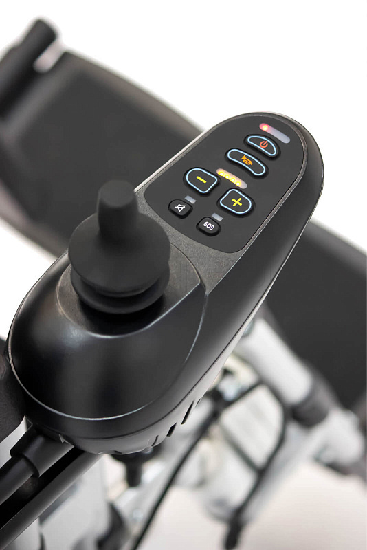 Коляска MET COMFORT AUTO имеет защитный механизм, который не дает креслу опрокинуться. Спинку коляски и подножки можно легко отрегулировать с помощью кнопок на пульте управления. Контроллер может быть расположен рядом с подлокотником как с правой, так и с левой стороны, что делает управление удобным не только для правшей, но и для левшей. На контроллере расположен джойстик для управления, рядом с ним находятся кнопки переключения скоростных режимов, кнопка звукового сигнала, кнопка SOS. В комплекте есть съёмный фонарик со встроенным USB и Type-C разъёмами, который можно использовать для зарядки телефона.