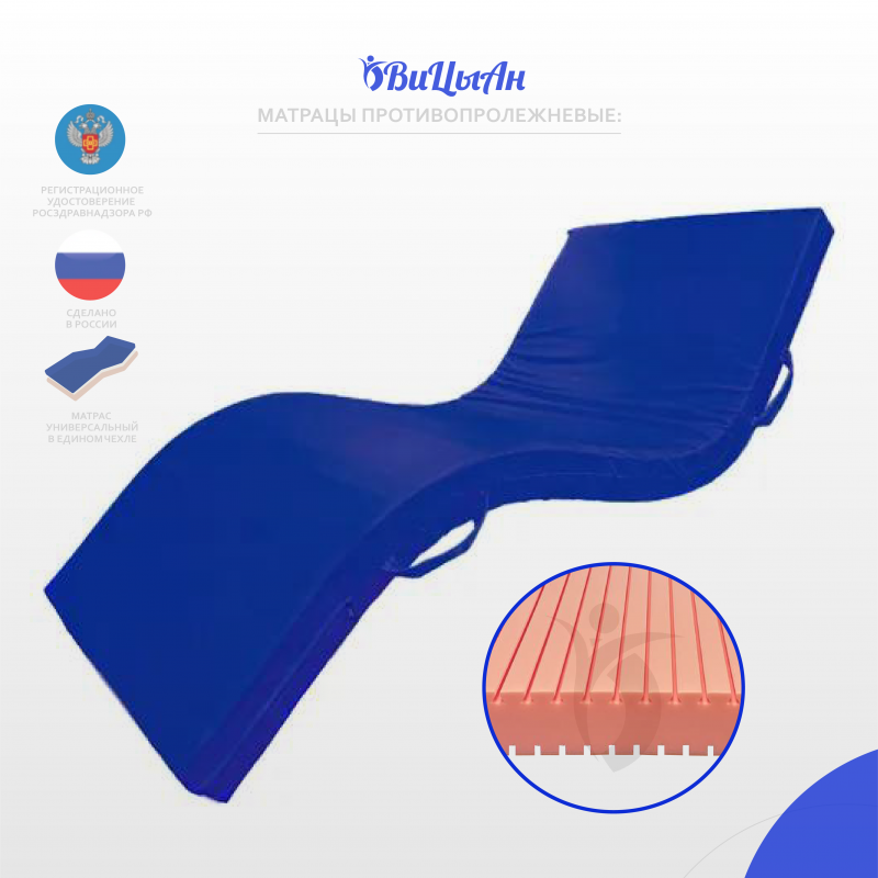 Уникальный, запатентованный, трапецевидный профиль на лицевой стороне матраца, формирует независимые конусы, которые эффективно распределяют давление тела на поверхности ложа кровати. - Поперечный профиль на нижней стороне матраца позволяет универсально принимать форму ложа 1-2-3-4-секционной кровати. - Влагонепроницаемый съемный чехол матраца изготовлен из мембранной, синтетической ткани (полиэстер 100%) с влагонепроницаемым полиуретановым покрытием плотностью 210 г/м², отличается высокой эластичностью и прочностью.- На чехле по центру торцевой части вшита молния.