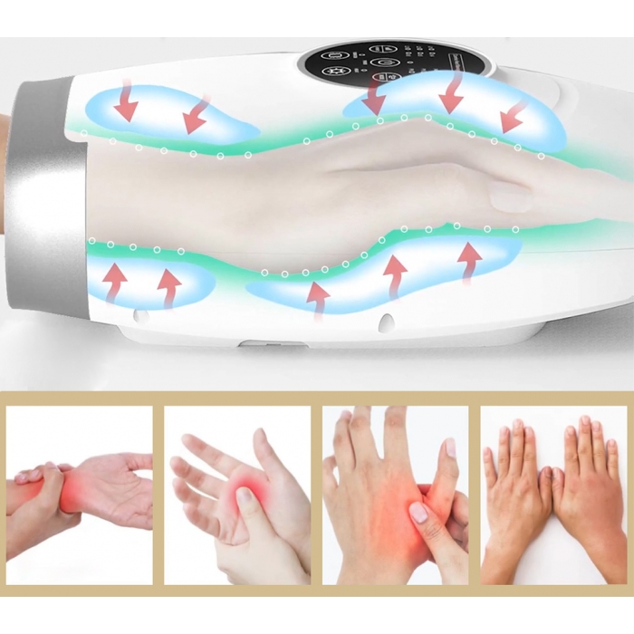 Прибор имеет отверстие для рук, а на умной панели с ЖК-экраном кнопка для выбора режима массажа для женщин или мужчин. Там же расположены кнопки: питания, режим интенсивности массажа (3 вида массажа), таймер показывающий время массажа, индикатор емкости аккумулятора (мигает в процессе зарядки и гаснет, когда полностью заряжен), поле с визуализацией места массируемой части кистей рук (красный цвет).