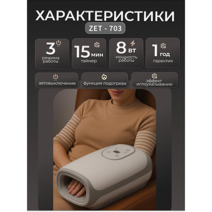 Уход для рук с Zet-703 - это акупунктурный массажер для рук, что безопасно, быстро и здорово! Всего 15 минут внимания каждый день уделяйте, чтобы мышцы кистей расслаблялись и предотвратить возрастную хроническую усталость рук и боли, деформацию суставов, отеки, дрожь.