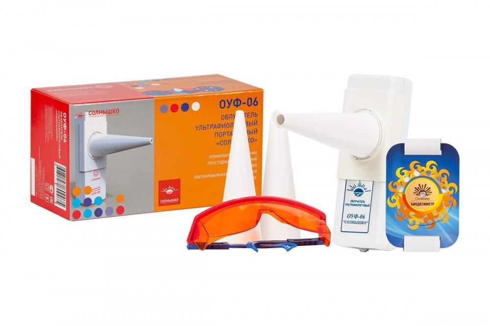 Ультрафиолетовый облучатель ОУФ-06 «Солнышко» портативный, это терапевтический и бактерицидный аппарат для бытового (домашнего) применения. Портативный облучатель предназначен для местного воздействия на отдельные участки человеческого тела и внутренние полости при заболеваниях в отоларингологии, хирургии, а также для обеззараживания воздуха в помещениях небольшого объема в лечебных, лечебно-профилактических, санаторно-курортных учреждениях, а также в домашних условиях. Для обеззараживания воздуха в автотранспортных средствах (в такси, катафалках, в автобусах, а также в личном транспорте).