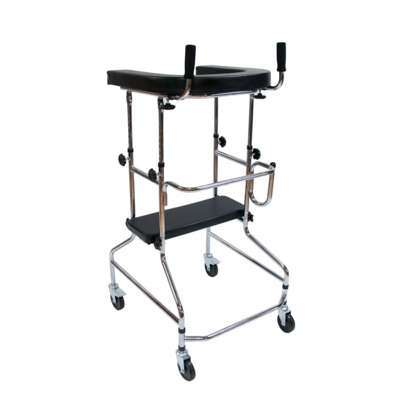 Конструкция ходунков разборная, выполнена из хромированной стали, сиденье и подлокотная опора – из искусственной кожи. Четыре колеса конструкции обеспечивают легкость передвижения без лишних усилий. Задние колеса оснащены стояночными тормозами.